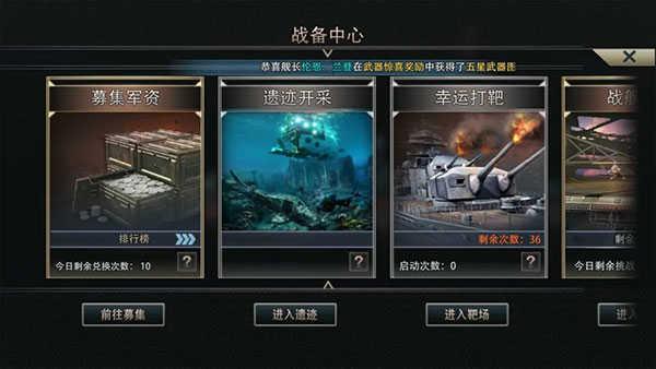 2、物资中心:当你在为武器强化材料,战舰配件强化材料发愁的时候,可以来物资中心逛一逛,这里不定期的出现一些材料,赶紧看看有没有你需要的吧。