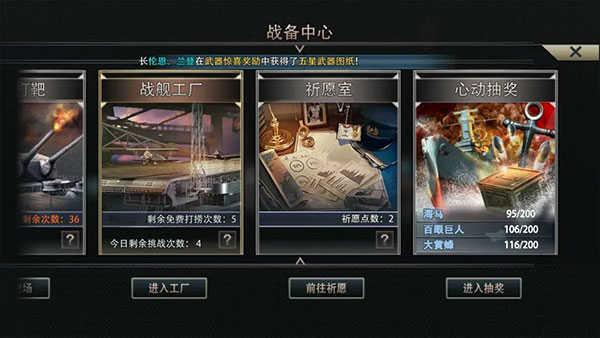4、战舰工厂:打捞战舰一般需要数月。每天有4次挑战次数和5次免费打捞。每次挑战,可以无限制打捞直到获得所有零部件,收获七张手稿;也可以用完免费打捞次数后提前终止打捞,根据打捞零部件数量收获对应数量手稿。每次挑战开始自动进行一次打捞。