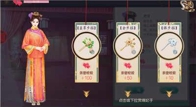 点击妃子的头像进入该妃子界面(如上图),选择赏赐,不同的步摇所加的【亲密经验】不同,当亲密经验达到升级条件时,妃子的【亲密度】将获得提高。赏赐是增加妃子亲密度的重要途径。