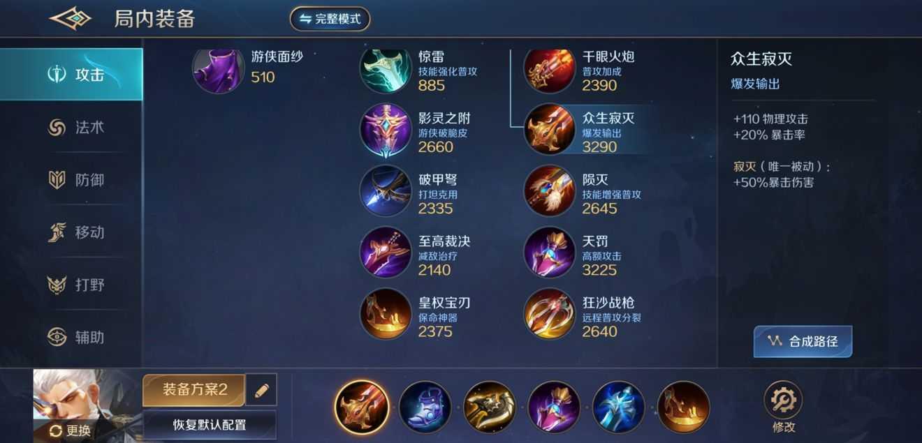 出装我建议出这套暴击装,黄忠主要依靠技能打出伤害,这套出装可以让他的技能打出最大伤害。配合蓝BUFF可以达到35%冷却缩减。核心装备众生寂灭第一件出,效果立竿见影(技能暴击也会增加50%伤害)。名刀增加黄忠生存能力,利用二技能从容逃生。