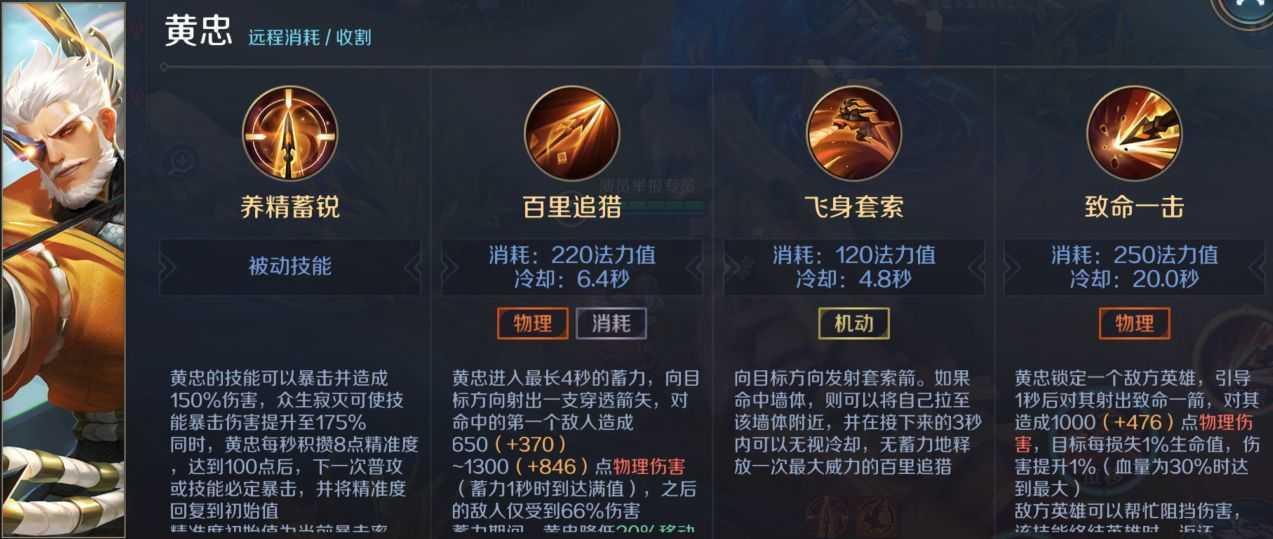 黄忠的技能可以暴击并造成150%伤害,众生寂灭可使技能暴击伤害提升至175% 同时,黄忠每秒积攒8点精准度,达到100点后,下一次普攻或技能必定暴击,并将精准度回复到初始值 精准度初始值为当前暴击率,脱战后精准度积攒速率翻倍。