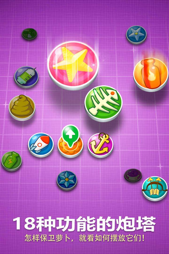 游戏中独有的试衣间、萝卜技能系统,可以改变萝卜形态,增强萝卜威力,让玩家可以对萝卜进行变装体验,在保卫萝卜之余体验到萝卜养成的成就感。