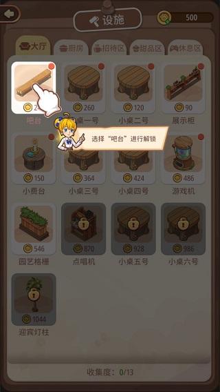 2、打扫完成后,点击“设施”,在这里你可以选择各种装饰、设备来打造你的餐厅。