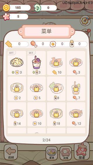 3、点击底部的菜单,花费一定会的数量的煎蛋、鸡腿、调料以及小麦来解锁升级新菜品,就能够满足更多客人的需求。