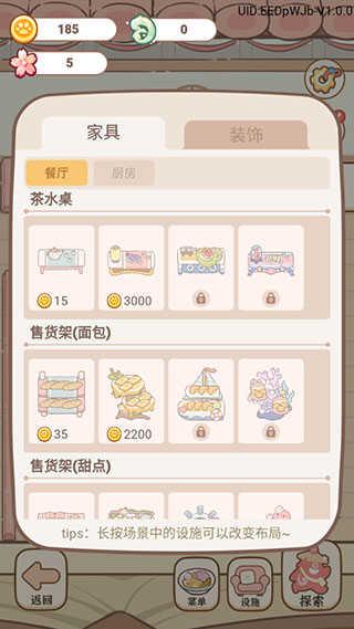 4、在“设施”内,对于餐厅和厨房分别都有不同的家具和装饰可以解锁,努力挣得更多的金币,装扮自己的旅店,客人的评分会更高。