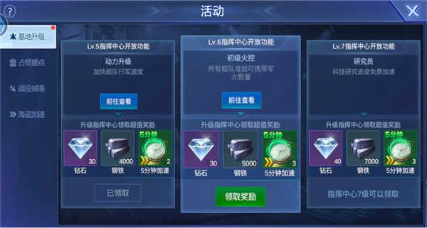 1、基地升级:指挥中心升到指定等级即可领取奖励;目前指挥中心开放至30级;