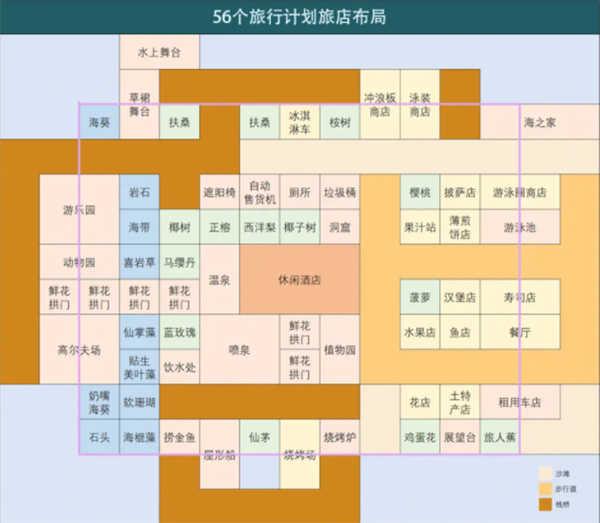 这个布局在设施有一大半就可以开始布局了,因为旅行计划很多加上休闲美食观光设施都有三个以上过洽谈非常容易,在路上设置满鲜花拱门还可以达成37,500G的使用费,需要说明的是56个旅行计划的旅店优势在于高使用费和洽谈容易通过,并不是冲旅店人气排名的最好选择,虽然到后期一样可以全S,但那是后期设施等级都很高的时候,想要在前期冲旅店排名请看旅店人气条目