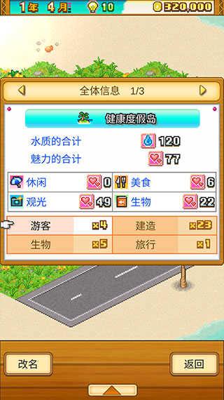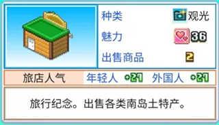 本作的魅力有四种:休闲魅力、美食魅力、观光魅力和生物魅力,界面右上角显示的是总魅力,总魅力越高来客量就越多(魅力对到访人数的提高有上限,上限大概是2w+魅力)