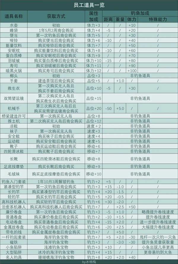 员工道具可以通过商会购买等途径获得,在增加员工能力的同时部分员工道具可以在钓鱼的时候装备以改变钓鱼的三项属性