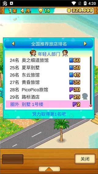 旅店排名的第一名所需数值是2000,用前面旅店人气条目提到的布局在前期就能第一了