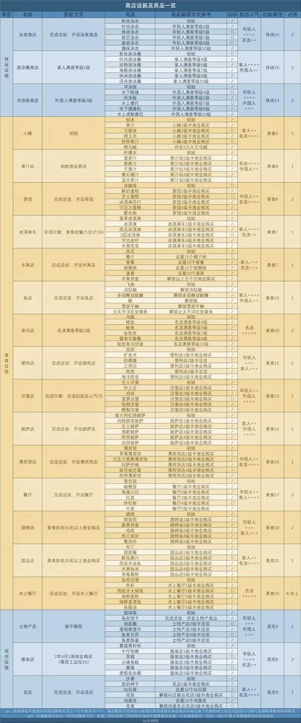 (商品的解锁表格里写了部分商品解锁商会购买不止需要等级,测试另外一个要求实在有点繁琐,目前知道的是1级半的商品购买没有其他要求设施等级够了就可以买,剩下的或多或少对旅店人气排名和顾客满意等级有要求,如果等级到了没开商品购买,可以去提升旅店人气/顾客满意等级)