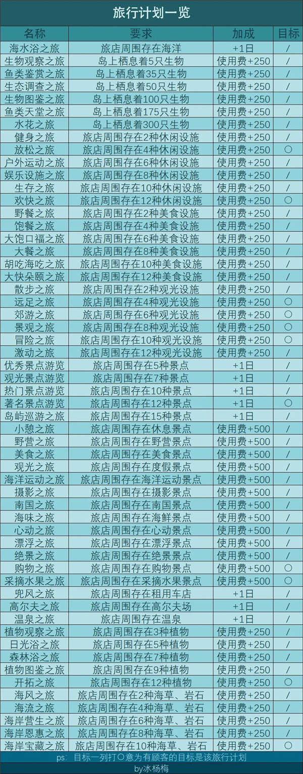 在旅店影响范围内设置设施达到要求就能增加旅店的旅行计划,旅行计划能增加旅店的使用费/住宿天数,还能增加洽谈贵宾的满意度。旅行计划由员工在旅店建造/改建时进行统计,旅行计划少的旅店会建的快一点因为没有旅行计划可以统计的部分跳过了。旅店建好后旅行计划只会减少不会增加,旅店影响范围内如果出现了新的设施达成了旅行计划需要改建才会加上去