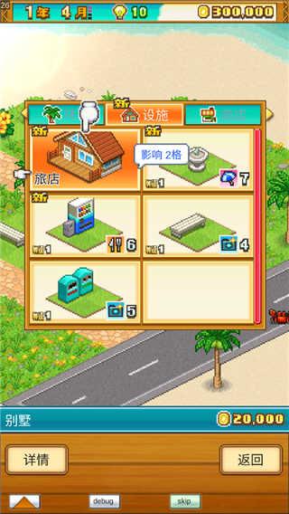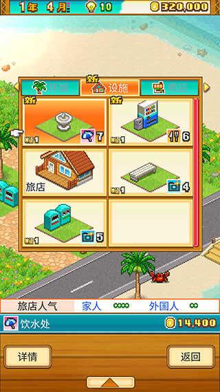 1、建造度假村的玩法,玩家能通过各种方式获得新的建筑或者设施,通过点击建筑能够看到建筑的详细信息,并且可以界面来对相关建筑使用道具。