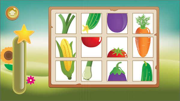 3、以蔬菜拼图玩法模式为例,小朋友需要点击蔬菜碎片将蔬菜合成一个;