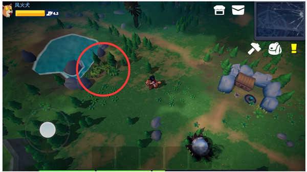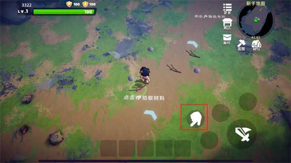 3、进入游戏后,玩家可以操控角色来收取一些材料,走到材料附近点击如下图的红色选款即可收取;