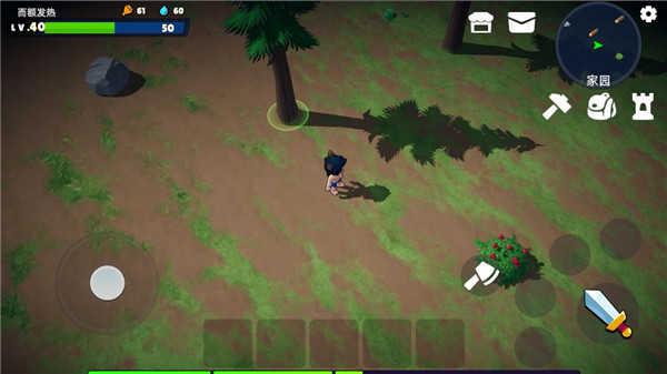 6、现在大家就可以穿上衣服拿上武器出去打怪(捡垃圾)了。这里给大家科普一下大概的地图的布局,一开始新手最好是去左边这个浅草滩的地图,怪物等级低,难度不高,如果被打可以直接吃红果子回血,前期升级快,很快就可以到达5+级,之后大家可以回家造一点储物箱,把东西都储存一下,然后去右边的这个小树林,这里的怪物比较厉害,大家要小心一点,尽量步步为营,当物资装备比较齐全后,大家可以去家园的左上,有一个叫石坑的地图,这里面石矿和铁矿较多,但是怪物攻击较高,大伙也要小心对待。
