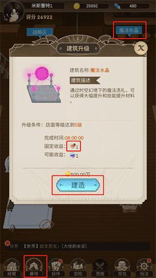 店面等级提升至5级,解锁建造魔法水晶,挂机产出徽章碎片。