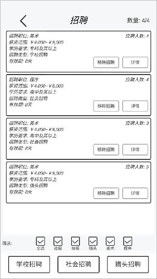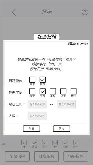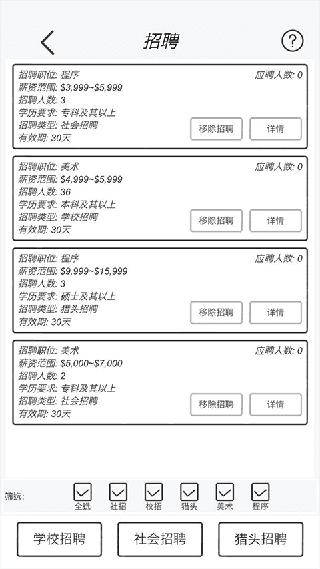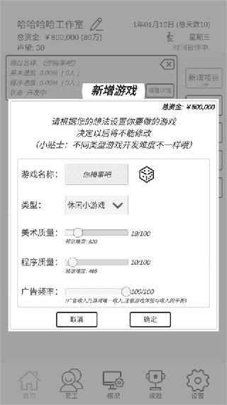 2、先新增添新项目,最好是休闲小游戏,再去招聘10个员工,最好招聘5个美术5个程序员工。