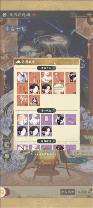 天衣许愿阁共分“梦入瑶池”“瀛洲阆苑”两个许愿池,每个许愿池都有独立的许愿奖励,可根据个人喜好选择对应的许愿池。