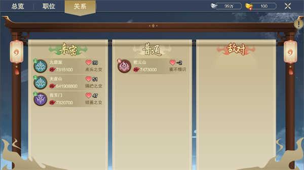 在关系界面中,掌门可以实时查看门派与江湖中各大宗门的关系好坏,与门派好感度高为亲密、好感度若是不高不低,则为普通,若是好感度为负值,就是对立。与各江湖门派之间的关系好坏将会产生一系列特殊的江湖事件,例如关系坏的的门派会来劫掠等等。