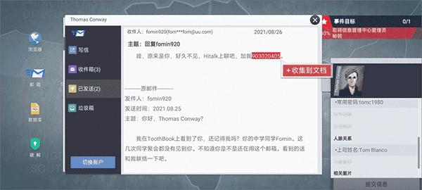 6、打开【邮箱】,登录目标人物的邮箱。查看【已发送】邮件,收集Hitalk账号【903020405】。查看【收件箱】邮件,收集部门负责人姓名【Tom Blanco】。