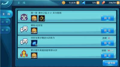 打开任务按钮,我们可以看到左边的标签分为三类,分别是主线、日常和成就。前期还是以主线任务为主,一路推进。根据章节任务的提示,攻打副本,获取奖励和经验。