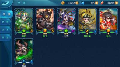 另外我们可以看到每个武将卡牌的下方会标注不同的标识和字母,标识代表武将的职业,例如华佗和小乔都属于奶妈定位,以绿色的树叶表示;贾诩是法师,以蓝色的剑表示;张飞和无名都属于坦克定位,以盾牌表示;黄月英属于射手,物理属性,以黄色剑表示。不同的字母代表不同的品质。级别由高到低:S/A+/A,高品质的武将基础属性会略高,培养的张力会更大。土豪玩家还可以从点将台里十连抽获得高级武将哦~