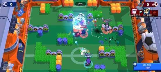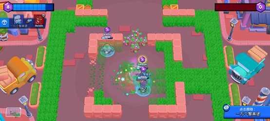 街头斗王2比较均衡,需要注意的是这是仅有的一张得分区内有硬性掩体的地图。利用两块L型掩体,充分施展“秦王绕柱”的本领,弥补英雄强度的不足。在这一地图中,右侧的长条连贯草丛很适合隐藏身形,迅速抵达右侧得分区,所以建议的英雄配伍是右侧单坦克,左侧辅助+战士。