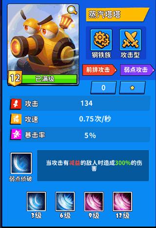 由于蒸汽塔塔的特殊机制,在攻击不带debuff的敌人时,蒸汽塔塔是个平平无奇的小火车头,但是一旦有了辅助塔塔给敌人添加debuff,蒸汽塔塔立马化身战神喀秋莎火箭炮,1级技能时攻击带有debuff的敌人就有3倍的额外伤害,卡牌升到12级时更有暴击几率和暴击伤害的加成,debuff层数越多加的暴击率和暴击伤害越高。