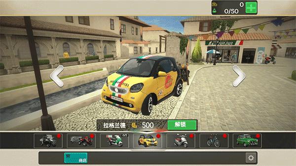 1、首先选择一辆驾驶工具,游戏刚开始你只有小摩托,等到你有了更多的钱就可以购买的别的车辆,开跑车送外卖也是有点帅的哈哈
