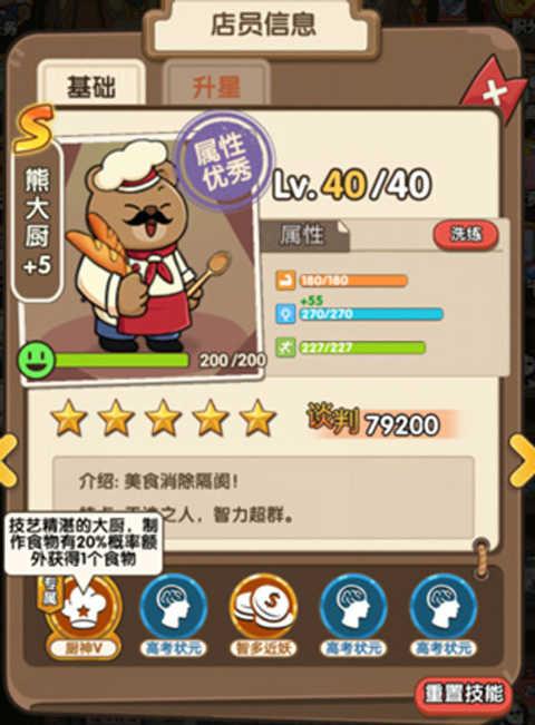 优先培养员工为:高智力的熊大厨,一个就够了(当需要做对应店铺的食物时,就把核心员工放到对应店铺即可,就会有加成,所以只需要培养一个熊大厨,极大的节省了培养材料),我把我完美属性的熊也喂给了下方的熊,升到五星。