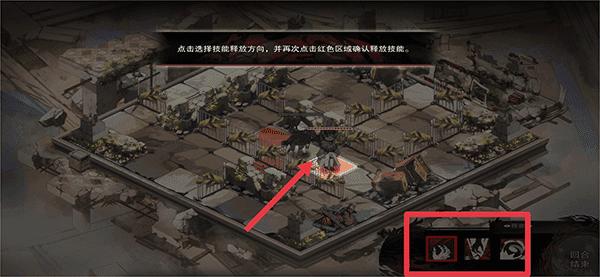 3、然后点击右下角的技能并点击选择技能释放的方向,接着再次点击红色区域释放技能