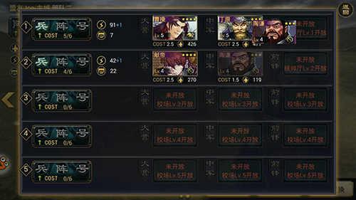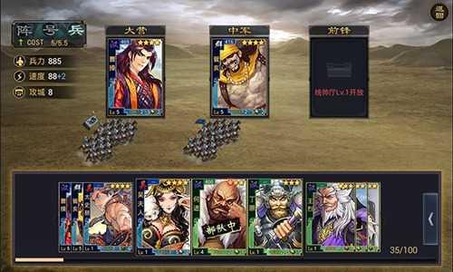 2、点击【部队配置】,将空闲的武将拖动到“大营”、“中军”、“前锋”等位置上,对应位置如果有武将就将被拖动的武将替换,之后点击“返回”即是完成部队编排。必须一提的是,同兵种、同阵营和特定称号组合的武将在同一部队中,可获得属性加成,而不同武将的技能、攻击距离各不相同,所以武将的搭配和位置十分讲究。建议是同阵营和特定称号的武将放在同一支部队,攻击远而防御强的骑兵放在“前锋”冲杀,而攻击距离较远而防御弱的弓兵、步兵放在中军和大营作为强力DPS。为什么不配同兵种部队?因为兵种之间存在相克,弓兵克骑兵,骑兵克步兵,步兵克弓兵,所以同兵种部队一般用来克制敌对玩家阵容,如敌对玩家多用弓兵武将部队,那么我就全用骑兵武将部队,当然,这样一来自己也非常容易被克制。