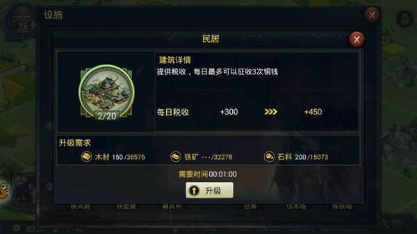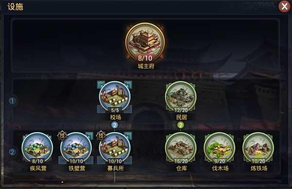 1、点击主城,并在右下角点击“设施”,就可以进入游戏的科技树系统。军事与城市建设这两大分支玩家可以根据需要着重发展其中一支,也可以并行发展。而且科技树系统以城主府等级为核心,相关科技需要城主府达到一定等级才可以研究并升级,如提高城区耐久度的科技“城墙”需要城主府达到四级才可建造。