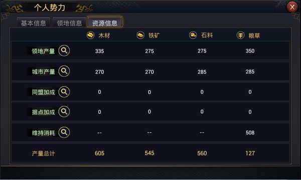 4)“资源信息”显示四大资源(木材、铁矿、石料、粮草)的生产情况,包括领地和城市产量、同盟和据点加成、维持消耗量等。通过资源产量的情况,玩家可以知道那些资源有余,那些资源紧缺,从而在扩张过程中有意地占据并争夺相关领地。