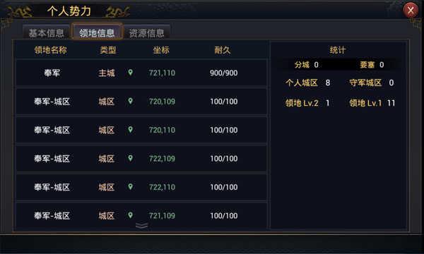 3)“领地信息”显示所有领地的类型、坐标、耐久、等级以及所占据的附属势力。分城、要塞、城区、各个等级的领地数目还会分别统计。