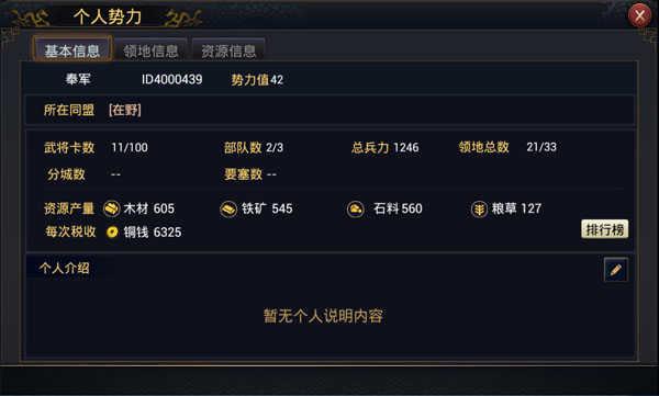 2)“基本信息”显示玩家的势力值,武将、部队、兵力、领地、分城、要塞的数量,以资源产量和税收收入,使玩家对自己的军事实力和资源产出一目了然。在最下方点击右侧编辑按钮还可修改自己独一无二的个人介绍。