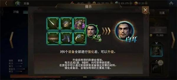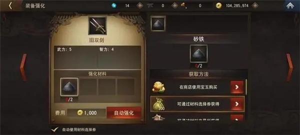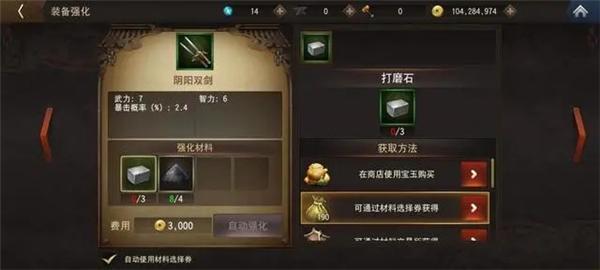 还是以刘备为例,对刘备身上的6个装备全部进行强化后,可以升级。升级后的将领防御会增加,每次达到C级、B级时都可得到新技能。例如刘备的旧双剑,需要强化材料砂铁,获得方式有多种,如玩家可在商店使用宝玉购买、通过材料选择券获得、材料交易以及桃园结义、黄天等玩法战斗获取,当然也可选择花费金币自动强化。进行强化后的旧双剑,从原先的武力5,智力4变为武力7,智力6,暴击概率为2.4%,同时名字也有所改变,为阴阳双剑。
