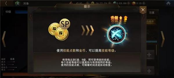 武将等级升完后,玩家可使用技能点数和金币提高技能等级。注意,将领每达到C级、B级,就能获得新技能。每个技能等级可以提高到与将领相同的等级,使用的技能点数随着时间流逝自动恢复。