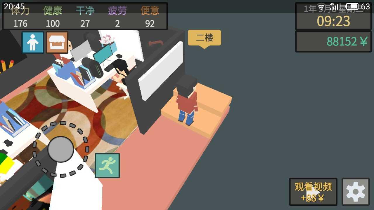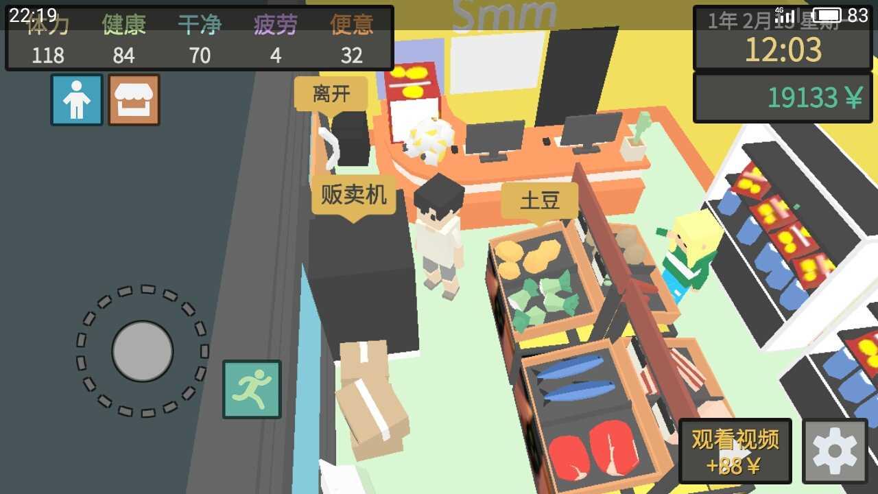拉完之后就去洗干净自己,洗五十分钟的,遇到泥水就再洗一次10分钟的,洗到干净100,接着回超市打工,按照上面说的循环,工作到300了就可以做员工了,做员工之前先把当天兼职打满3次,然后整理状态!整理状态!要不然会打乱接下来的循环,尽量都做6小时的,要不然很容易乱,循环顺序——打工→吃士力架→打工→吃士力架→打工→吃士力架→桥洞底拉粑粑→洗干净→打工……循环下来,慢慢做,不着急,虽然有些繁琐,一定要坚持,这样才能体会到游戏中后期的乐趣,经过十几天不懈的努力,我们的工作总算3000了,这时依旧整理状态再做店长,循环顺序如上就好,还是得慢慢来,谁叫我们是打工人呢?熬到管理值到两千,这时已经基本上要脱离新手期了,就可以租房子了,此时此刻时间已经是快3月了,我们也有12000多了,房子方面,不要租平房,没啥用。在租公寓前,先买一些维生素和菜,维生素你谨慎就不用买,菜先买100青菜,100胡萝卜,鸡腿多买,买200左右