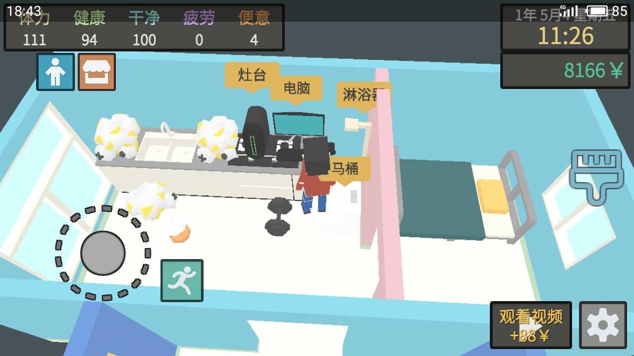 客厅的位置放上一个单人床基本就占满了整个空间了,不过萝卜还是在边角安排上了几件功能性家具,如灶台、电脑、马桶、洗手池等等,这些家具基本上也满足了恢复五个状态值的需要。