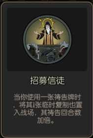 6、招募信徒:和月光启迪相性极好。月光+招募,招募出来的厄运是7轮。(2*4-1)招募信徒增加了场上祷告牌数量的一倍,考虑到回合数,近似是0.5倍。