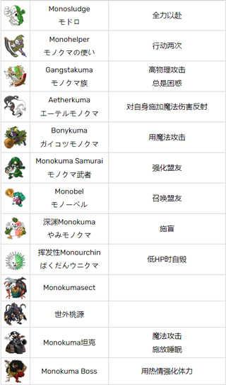 有 26 种主要敌人类型,每种类型都有许多不同颜色的交替形式,可以增加力量。其中一些变种有另一种眼睛颜色,这表明它们的元素弱点(例如,如果它们有黄色的眼睛,它们对闪电很弱)。并非所有敌人都有这个元素弱点,但它很有用。