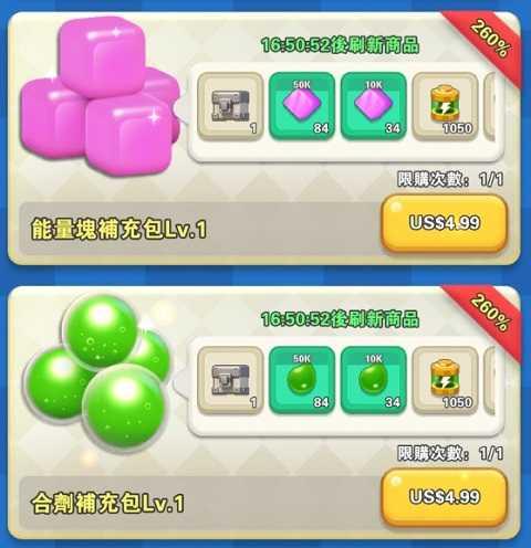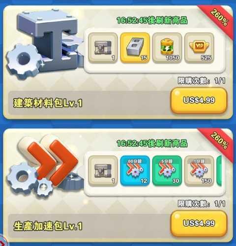 生产加速包则提供可立即让生产中的道具进行加速【生产加速1小时】、【生产加速5分钟】、【生产加速1分钟】等以及【电池】, 更有可用于升级建筑、生产、科技研究的重要物品能量块包含其中。