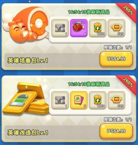 英雄改造包则针对提供高级改造卡有需求的玩家,礼包内一样附有【电池】,还有可进行抽卡的道具【高级改造卡】。