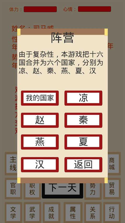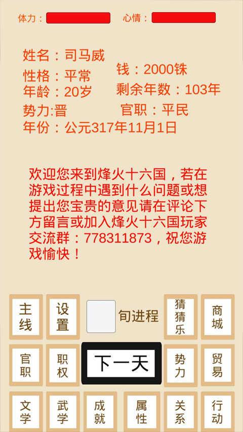 烽火十六国是一款由威之铭工作室研发的文字模拟器游戏。游戏中玩家可以体验到十六国时期的风云变幻,可以选择入朝为官,造福百姓;也可以选择成为一介平民,与世无争;或是成为一名文臣,辅佐君王;亦或者成为一名武将,征战天下。不同的选择代表着不同人生,让玩家真实体验到古代风云变幻的魅力,对这款游戏感兴趣的小伙伴们,抓紧在本站下载安装吧。