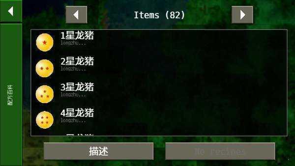 龙珠神器必须由龙珠合成,下面有部分合成表,其中连发枪需要七颗龙珠,无线耐久,但伤害可观,龙珠武器中基岩刀伤害最高,还有屠龙,斧头伤害也还不错,都属于本mod高端神器,具体数值参考游戏内。另外还有最强套装姨妈套,防御杠杠的,移动速度加成非常七颗龙珠,还有紫金珠的样子