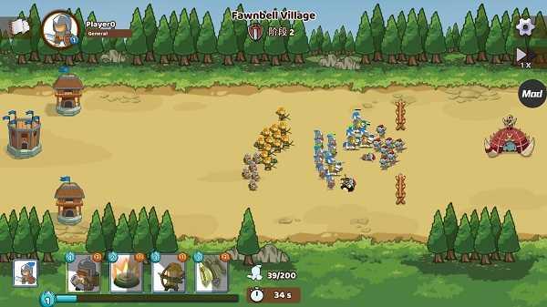 2、成功进入关卡后,在界面的左侧下方,分别是你可用的队伍,蓝色条能是你的能量,不同队伍的招募需要对应的能量才能进行,比如炮兵需要4格、弓箭手需要3格、地雷需要2格、骑兵需要3格,后续玩家还能解锁更多兵种。关于放置,只要满足一定的能量后,拖动屏幕上的兵种到战场上即可。