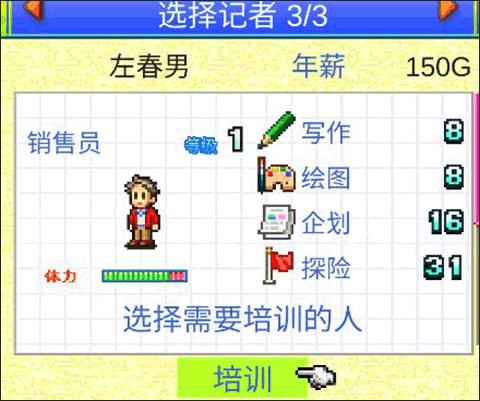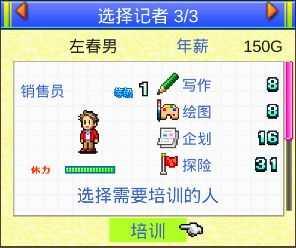 好的杂志离不开记者属性,第一次招聘完成之后还剩下1100。这些钱不要浪费,700培养一次,300培养一次,用来堆那个属性最高的人。培养结束后会出现资金困难,秘书送给你2000。加上剩下的100,2100还可以用700的培养3次。直到把钱花光,我们可以开始创建杂志啦!第一次可以选择河岸钓鱼或者商店街购物或者广场躲避球,因为这三个都是具有比较好的相性。当然也可以使用其他搭配,具体参考相性表。推荐使用广场躲避球的组合,因为初始读者群是少男少女,躲避球可以面向儿童与学生,有助于提高销量。