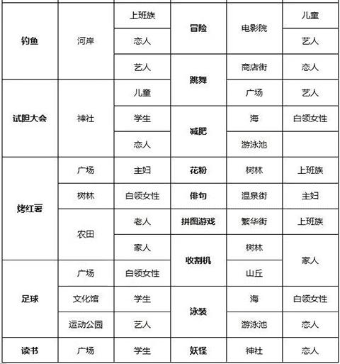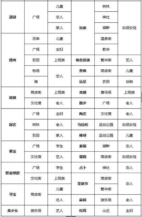 5、最后是郊游、治愈、烤肉、角色扮演、祭典、远足、将棋、竞猜、散步、园艺、陶艺、马拉松、棒球、拳法、素描、蛋糕、职业摔跤、占卜、圣诞节、寻宝、麻将、美少女、松茸。